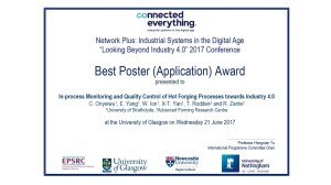 The Best Poster (Application) award was won by “In-process Monitoring and Quality Control of Hot Forging Processes towards Industry 4.0″ C. Onyeiwu(1), E. Yang(1), W. Ion(1), X-T. Yan(1), T. Rodden(2) and R. Zante(2) [(1)University of Strathclyde, (2)Advanced Forming Research Centre]