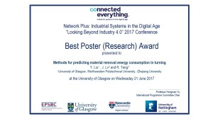 The Best Poster (Research) award was won by “Methods for predicting material removal energy consumption in turning” Y. Liu(1) , J. Lv(2) and R. Tang(3) [(1)University of Glasgow, (2)Northwestern Polytechnical University, (3)Zhejiang University].